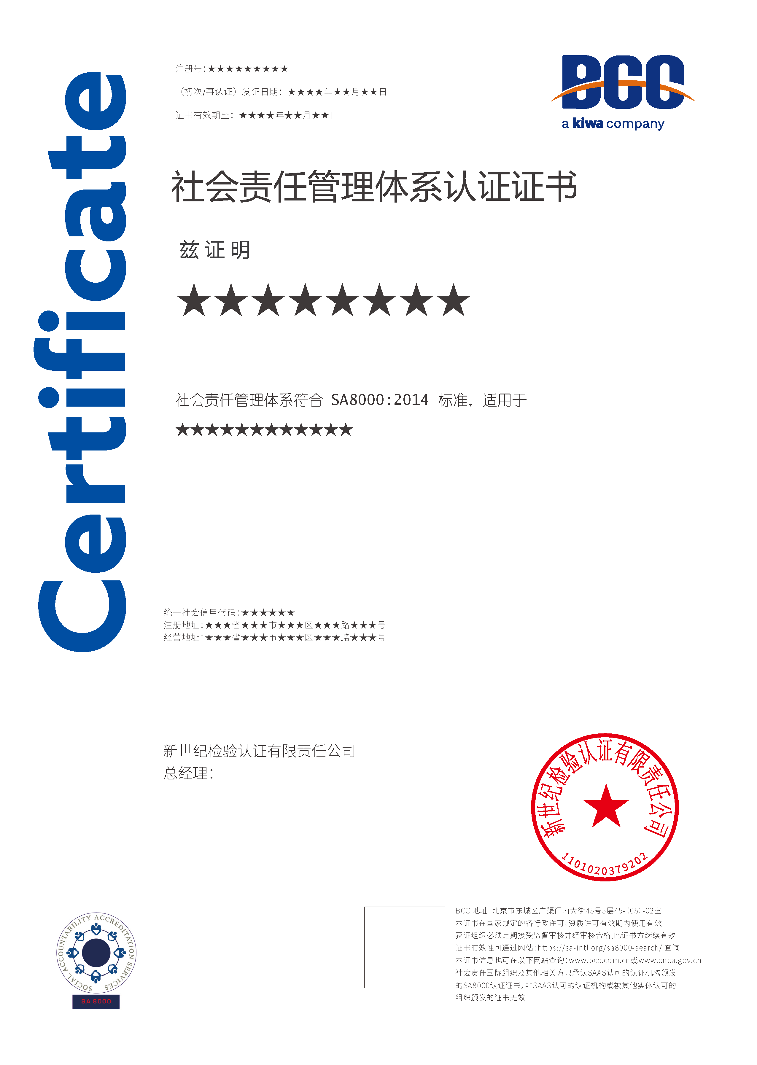 現(xiàn)行SA8000認(rèn)證使用的標(biāo)準(zhǔn)是SA8000:2014,該標(biāo)準(zhǔn)是由美國SAI(社會責(zé)任國際組織)制定發(fā)布的。SA8000標(biāo)準(zhǔn)涵蓋九個方面:童工、強(qiáng)迫勞動、健康與安全、結(jié)社自由及集體談判的權(quán)利、歧視、懲罰措施、工作時間、報酬和管理體系。