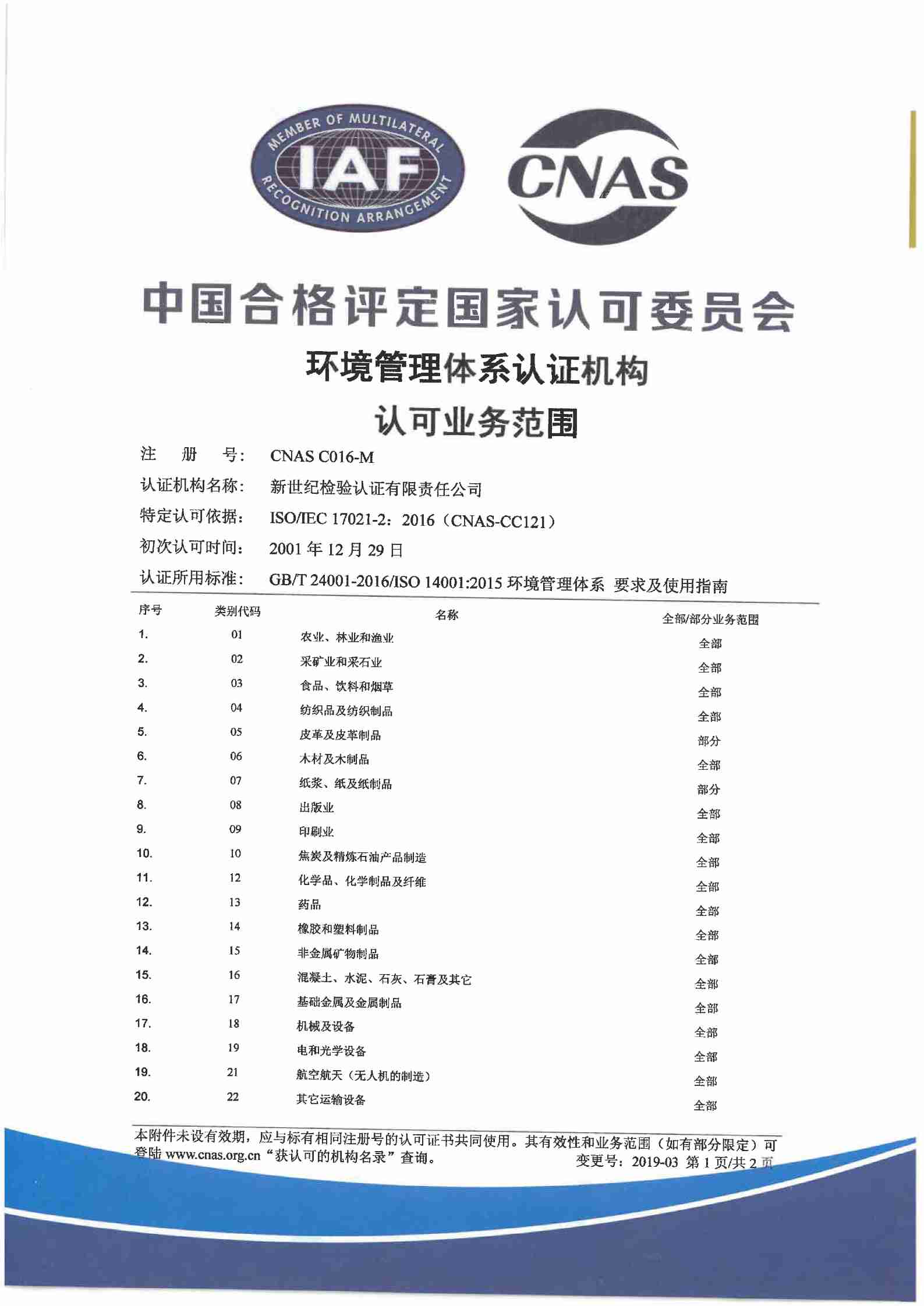 環(huán)境管理體系認證機構(gòu)認可證書(一) |