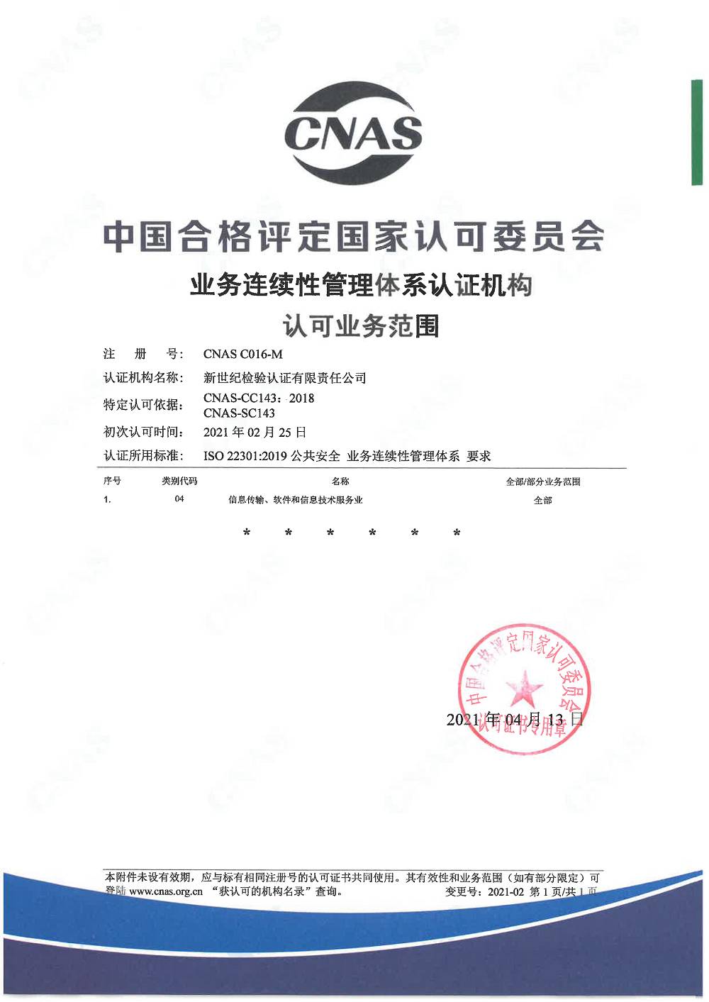 業(yè)務連續(xù)性管理體系認證機構(gòu)認可證書 |