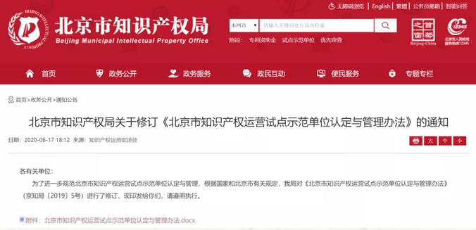 6月17日,為深化實(shí)施創(chuàng)新驅(qū)動(dòng)戰(zhàn)略和首都知識(shí)產(chǎn)權(quán)戰(zhàn)略,進(jìn)一步規(guī)范知識(shí)產(chǎn)權(quán)試點(diǎn)示范單位認(rèn)定與管理工作,北京市知識(shí)產(chǎn)權(quán)局修訂的《北京市知識(shí)產(chǎn)權(quán)試點(diǎn)示范單位認(rèn)定與管理辦法》(京知局〔2020〕171號(hào))正式發(fā)布。